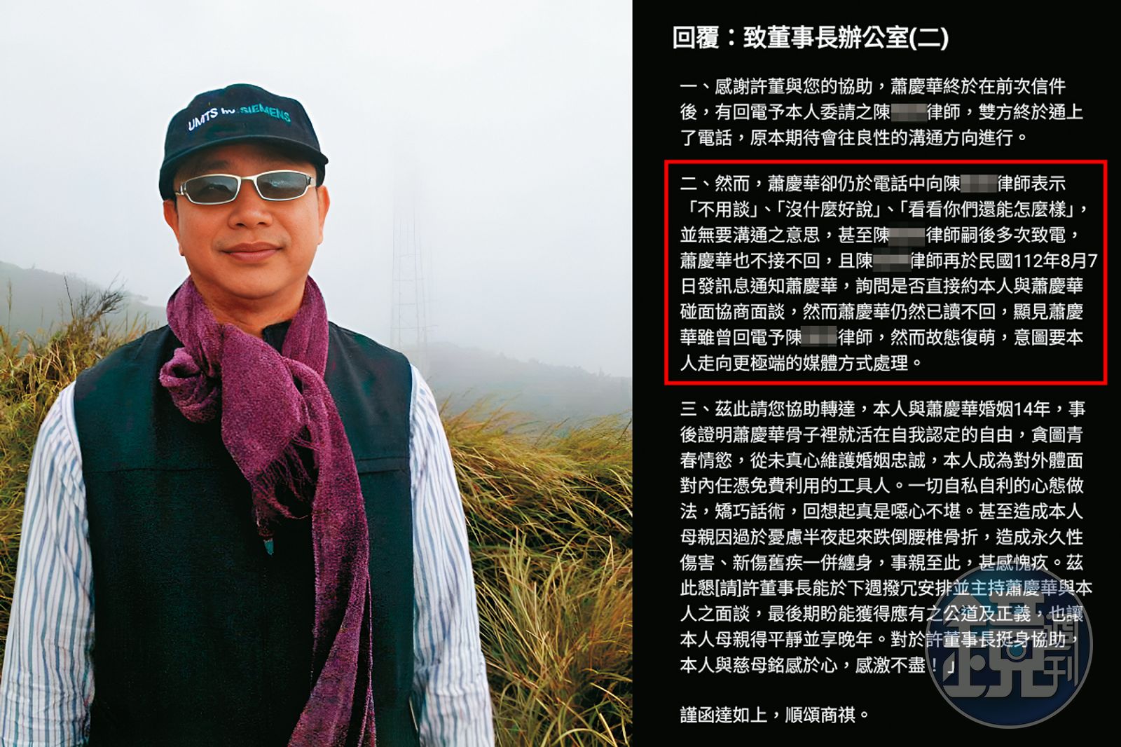 知情人士A先生向本刊透露,蕭慶華去年9月才風光宣布要兼任公司發言人,卻在今年6月21日就被撤換,由財務長暫代職務,可能是因蕭妻不滿蕭偷吃又逼宮,多次委請律師寫信向許陳情,希望蕭出面道歉有關。