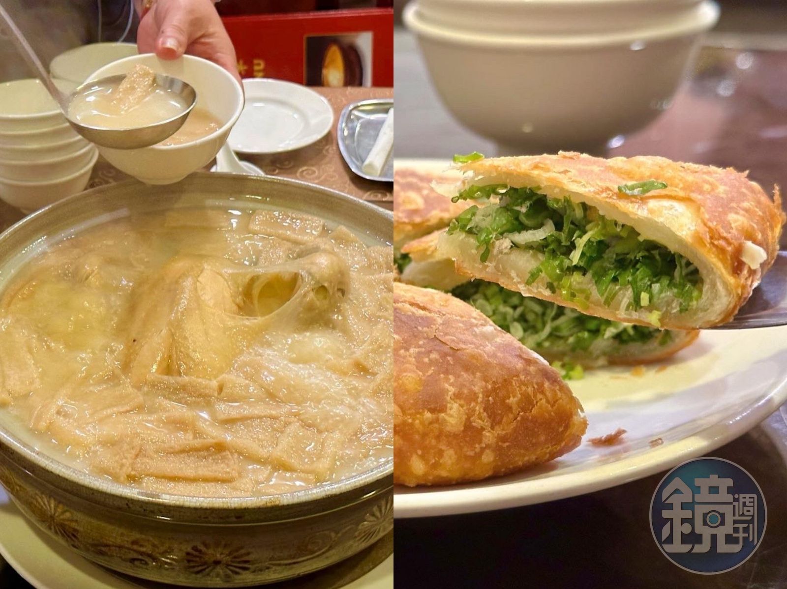 或許好喝雞湯不算難找,所以喝完一碗,算是在期待值內。讓我感到興奮的是緊接上桌的厚餅,身為蔥油餅控,第一次看到這種作法,類似餡餅的包法,但裡頭塞滿新鮮蔥花。外皮薄酥又有嚼勁,青蔥切得極細,蔥味噴發又鮮甜,整個餅自帶鹹味,完全不需要沾醬。