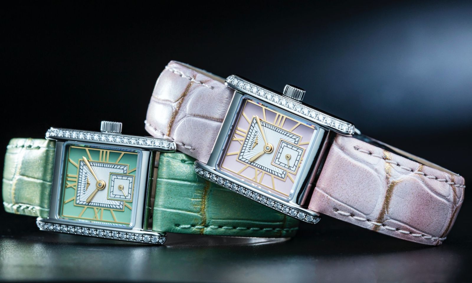 LONGINES從經典長方形錶款DolceVita演化而來的全新 Mini DolceVita 「迷你多情系列」,錶殼尺寸21.5毫米 X 29毫米,鑲鑽腕錶提供三種新式面盤搭配不鏽鋼鍊帶,以及四款彩色高級鱷魚皮革錶帶。設計來自於1920年代浪琴古董錶,並呼應當時的Art Deco裝飾藝術風格,尤其全新鍊節設計有如珠寶飾品,也大幅提升浪琴的品牌定位。(攝影:游銘元)