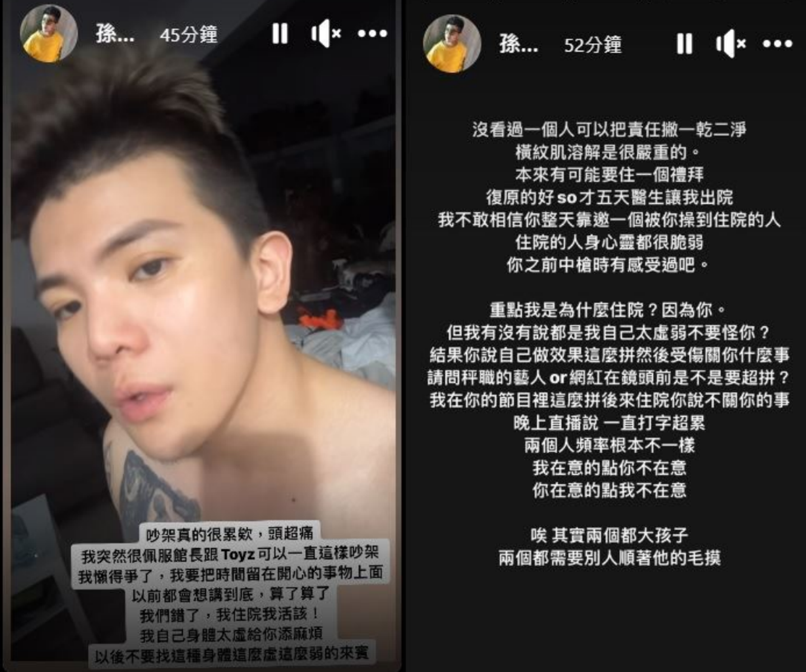 但孫生講一講又示弱,說打字太累,晚上要開直播講清楚,「吵架真的很累,頭超痛,我突然很佩服館長跟Toyz可以一直這樣吵架,以前都會想講到底,算了算了,我住院我活該!我自己身體太虛給你添麻煩,以後不要找身體這麼虛這麼弱的來賓。」