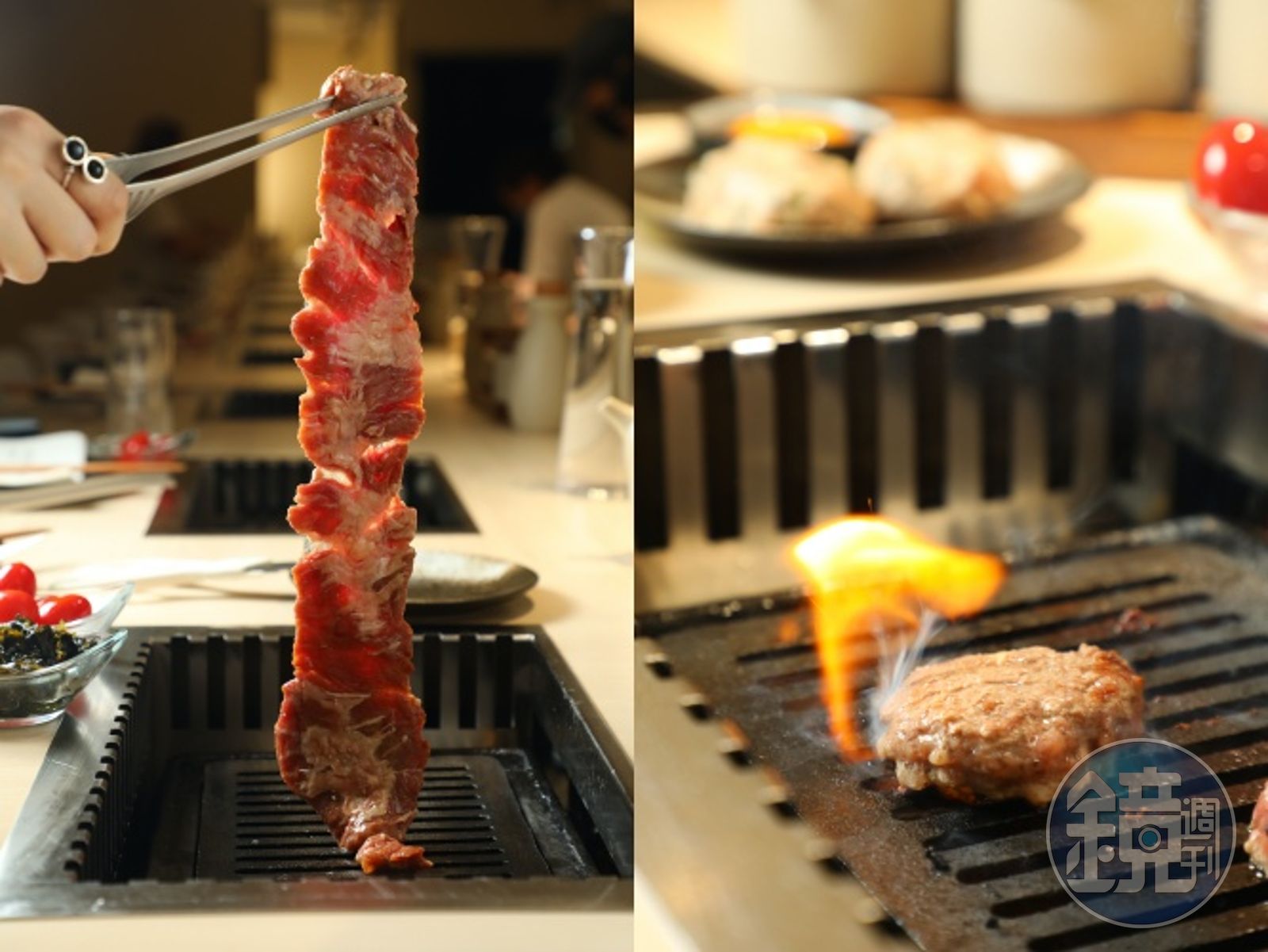 激推「招牌月見雞肉棒子」雞肉打碎加上蔥花,裡頭還有雞軟骨增添口感。(200元/份)「月見和牛漢堡排」是店內人氣商品,和牛油脂豐富,肉質吃起來扎實多汁不乾柴。(380元/份)老饕最愛「美國熟成橫隔膜」整片上桌,想吃多大塊自己剪。(140元/份)店內菜單均價不高,百元就能吃到日本A5和牛等級的肉品,但充分提供日式高級燒烤店的講究感,對於不太會烤肉的人,有師傅在一旁指導,熟度絕不會出錯;醬料有主廚祕制的柚子燒肉醬、原味燒肉醬、特製辣椒粉、日式蔥鹽及香蒜鹽可選擇,一盤肉吃出多種風味,儀式感滿滿,一人食也絕不能怠慢了自己。
