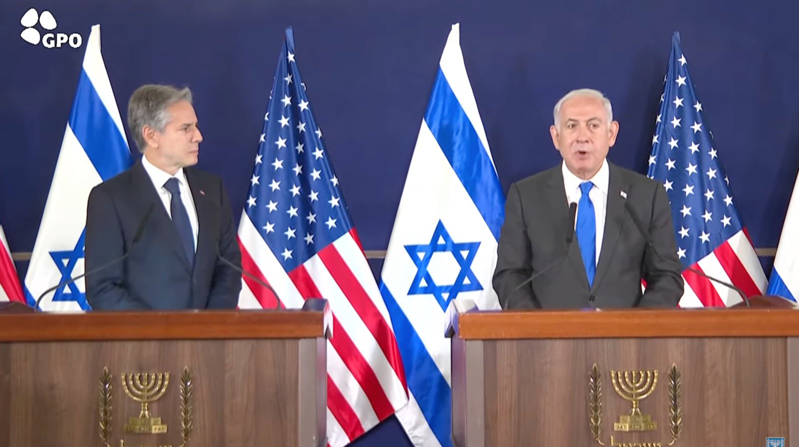 布林肯和納坦雅胡後也一同召開記者會發表公開談話,根據《以色列時報》報導,納坦雅胡在演講中感謝布林肯來到特拉維夫表達美國對以色列的支持,也斥責哈瑪斯是文明的敵人,不僅在音樂節屠殺年輕人,還在父母面前殺害孩子、孩子面前殺害父母,將人活活燒死、斬首等。