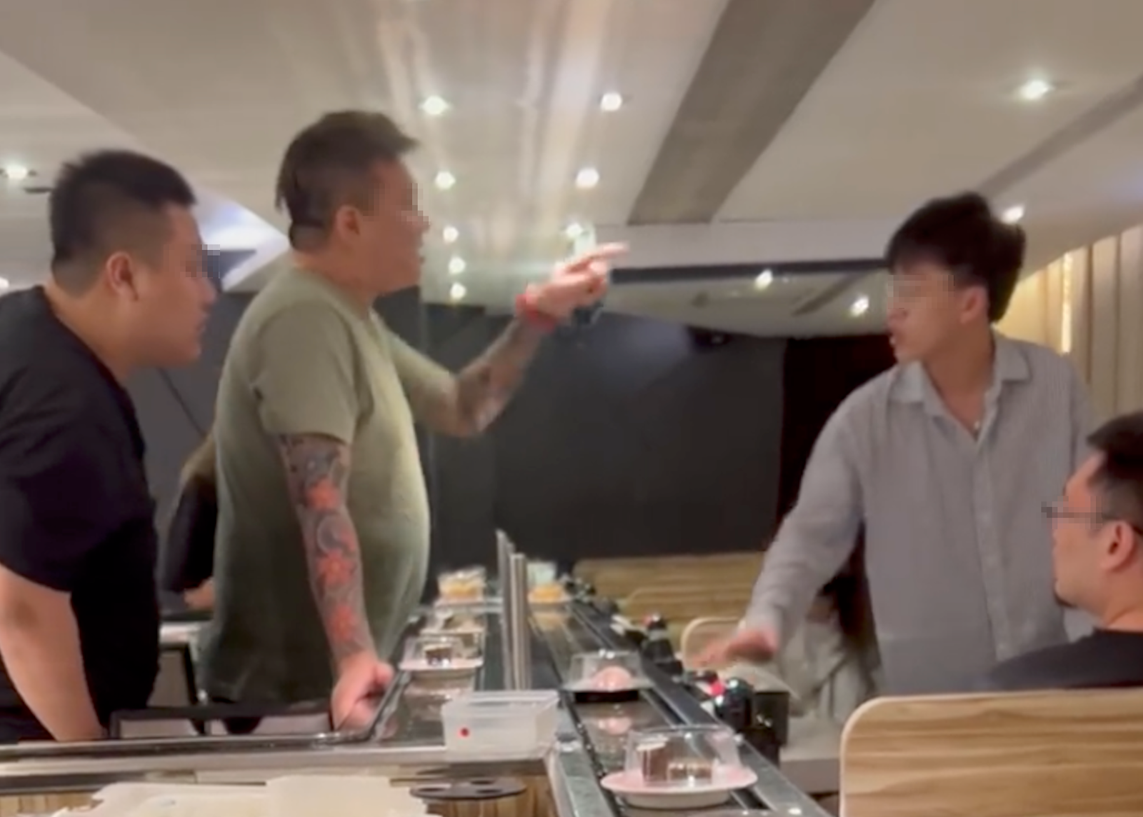 「茶碗蒸」事件兩段影片在網路瘋傳,第一段影片顯示,刺青男在壽司店,先是對著遠處的眼鏡男叫囂:「你看著我幹嘛?」眼鏡男則也不客氣回應:「有什麼問題啦?我點個茶碗蒸有什麼問題啦?」隨後刺青男與另一名友人早上前示威。