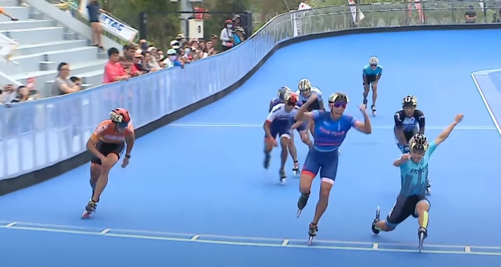 回顧杭州亞運競速滑輪接力3,000公尺接力賽,當時南韓選手鄭喆元因過早慶祝而洩力,台灣隊最後一棒黃玉霖抓準時機,奮力伸腳先觸碰終點線,台灣隊以0.01秒的差距順利奪金。
