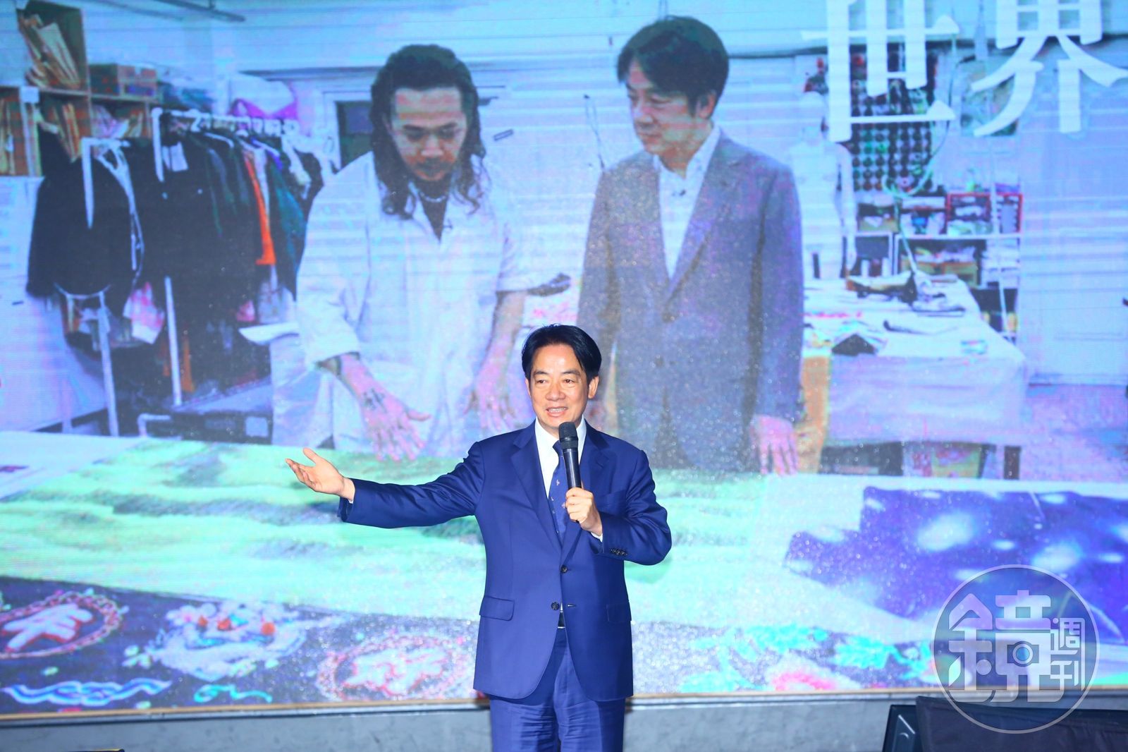 對於追求「文化永續、世界台灣」的文化願景,賴清德也提出2個承諾與8個主張。2項承諾包含在總統任內政府每年將寬列文化預算、持續提高,去從事文化建設;其次落實行政院文化會報機制,推動跨域的文化治理,要讓各部都有文化思維,每個首長都是文化部長。