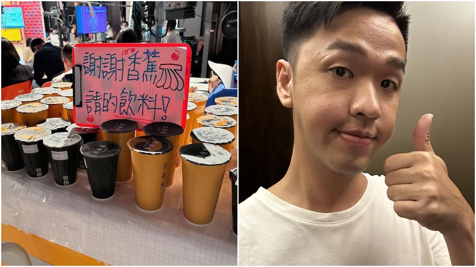 前陣子香蕉與小9歲女友Timmy登記結婚升格為人夫,他昨天到攝影棚錄影發現工作人員很熟悉,仔細看發現是以前的老東家,他直接訂飲料請請大家喝,寫道:「謝謝一路節儉努力的自己,十年存到些錢了也要懂得回饋,因為我喝飲料會很開心,我也希望喝到的每個人都開心。」