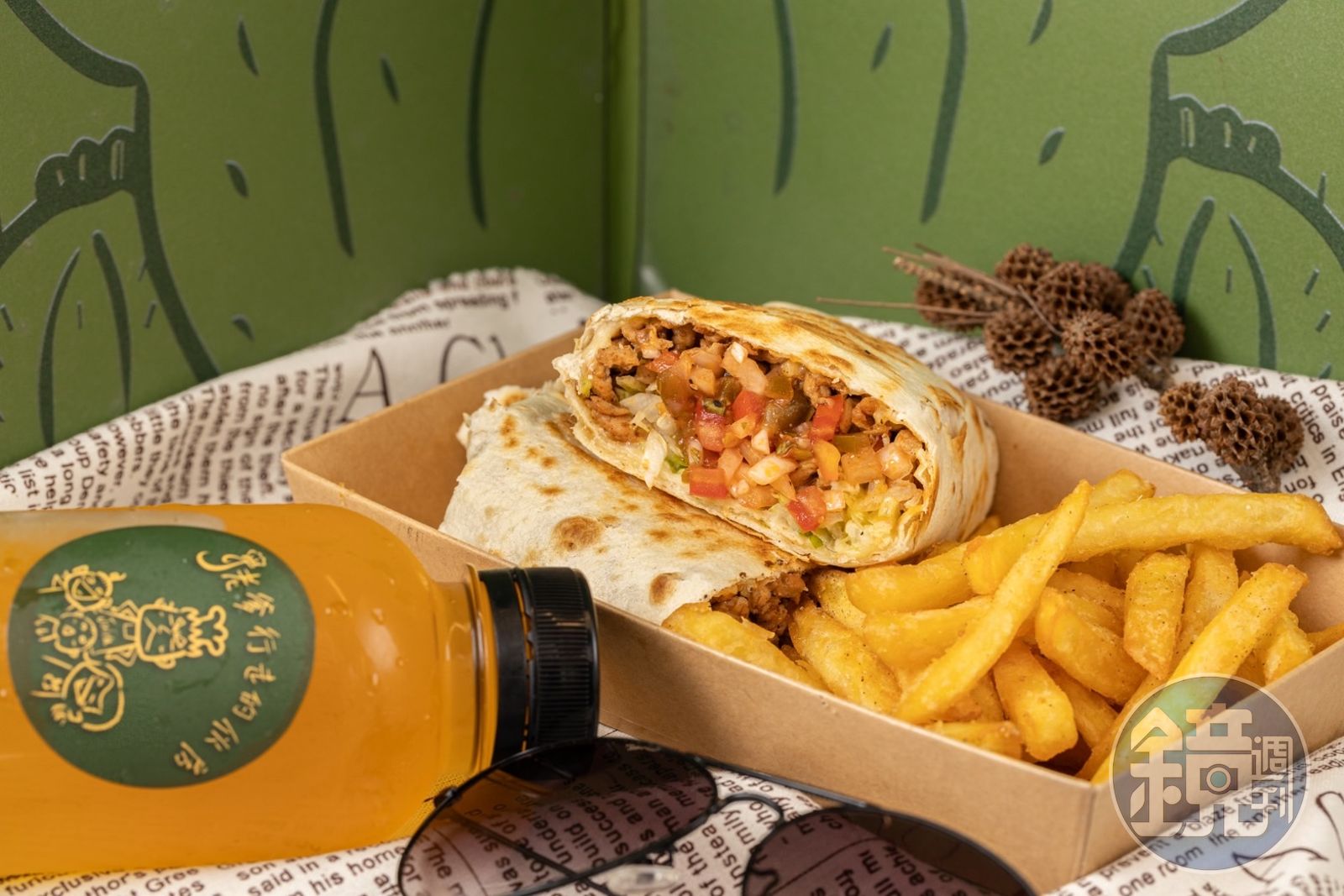 許志鴻在Burrito餅皮上鋪上炒肉,以及大把洋蔥、生菜絲。單吃就超下飯的「泰式打拋豬」,變成墨西哥捲餅內餡也同樣開胃、不違和。(140元/份)招牌「J老爹醬燒雞」會事先以祕製醬料醃製雞胸肉,再以鐵板快炒,加入自己調配的微辛口莎莎醬,真是第一捲開胃、第二捲飽足!再搭配套餐的薯條、飲料,只能說輕食的分量也不容低估。