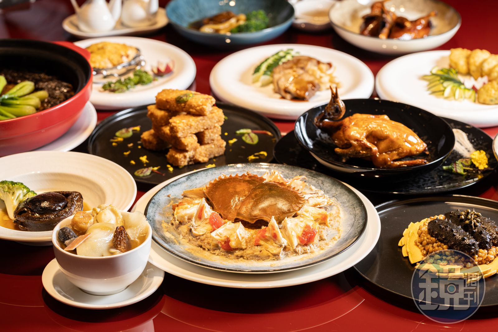 菜單上的佛跳牆,根本是加了鮑魚、海參、干貝、響螺片和羊肚菌的港式燉湯,湯色澄清,鮮味全匯聚在湯裡,喝完這一盅,幸福感就已經爆表,更別提還有「鮑魚花菇炆鵝掌」「蟹粉松茸焗蟹蓋」「膏蟹馬蹄蒸肉餅」在等待,這些菜色常在知名粵廚的餐桌上現身,在Eddie的手裡,選材更加講究,做法更加細緻,還藏了不少獨門手法,一吃就知高下。