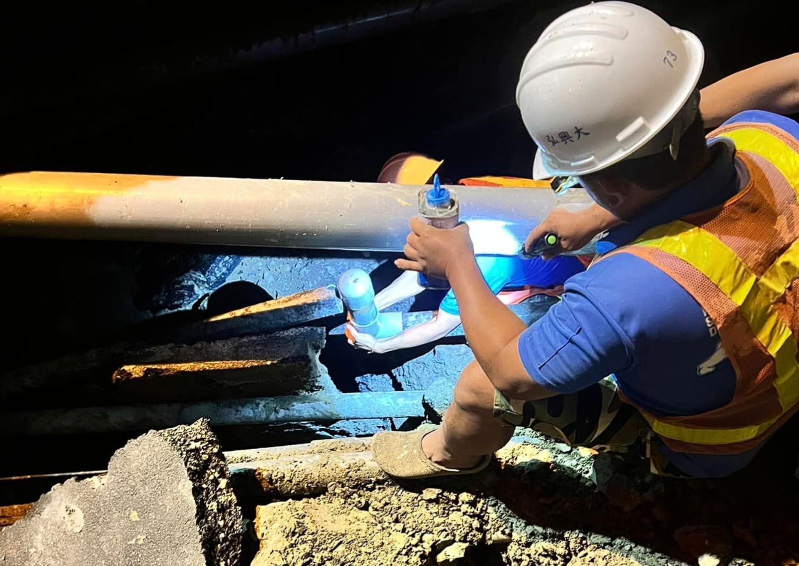 竹北新天坑驚傳自來水及瓦斯外洩,新竹縣長楊文科深夜趕往現場了解情況,經了解是因側管溝破裂,導致水進入工地不斷沖刷,沖毀路基、破壞管線導致事故發生,緊急搶修開挖,也地底下已被掏空。