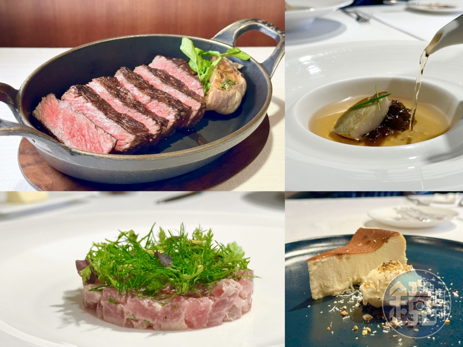 在前菜與牛排間串場的「上湯煨鮑魚海參」,突然又有讓人置身中餐廳的錯覺。以老母雞、金華火腿和排骨熬上至少8小時的高湯,經過澄清處理後,質地乾淨清爽,有濃郁雞味。用雞湯煨煮的海參,軟Q有味,鮑魚脆彈鮮美。