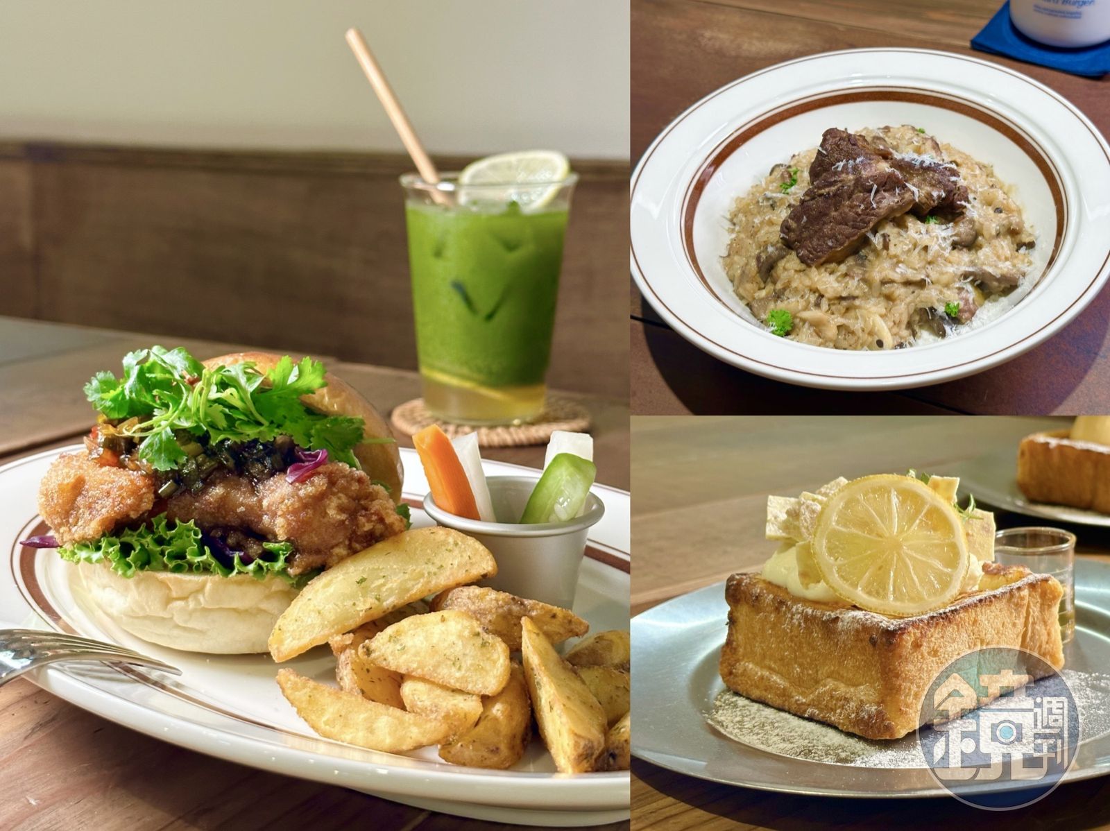 「炙烤油揚田樂牛肉堡」以手打牛肉漢堡排搭配炙烤豆皮,再淋上味噌醬,偏日式風味。(290元/份)「松露味噌牛肋燉飯」米粒吸飽綜合菌菇的香氣,牛肋條以法式紅酒燉牛肉的味道呈現。(480元/份)「宇治利休抹茶檸檬氣泡」茶味濃厚,涼爽氣泡感可刷洗味蕾。(150元/杯)整體來說,我覺得漢堡是好吃的,不論是麵包體的酥脆感,醬汁的特殊性,尤其還有滿多種創意口味,可以讓漢堡控嘗鮮。如果法式吐司是熱騰騰上桌,會是更好的收尾。