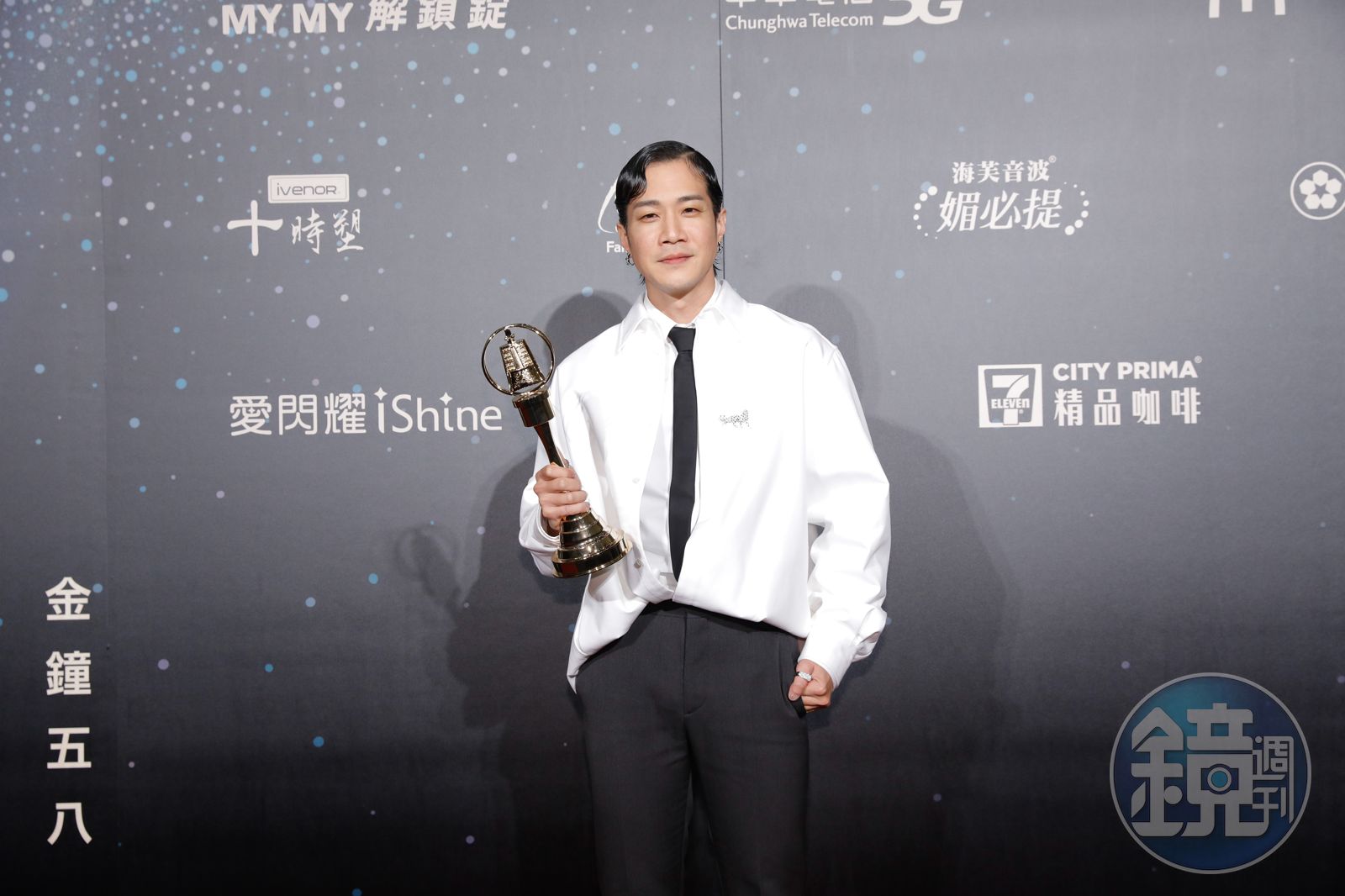 頒獎典禮上,薛仕凌身穿Valentino襯衫式外套(NT$67,000)、 襯衫(NT$33,000)、褲子(NT$57,000)、領帶(NT$15,800)。(Valentino提供)薛仕凌身穿Valentino「Black Tie」系列登台領獎。(Valentino提供)這麼巧,薛仕凌就穿著這套Valentino領取金鐘獎。他還特地謝謝自己的髮型師,因為他在釜山拿下第28屆亞洲內容暨國際OTT大獎最佳男配角時,也是同一個髮型。