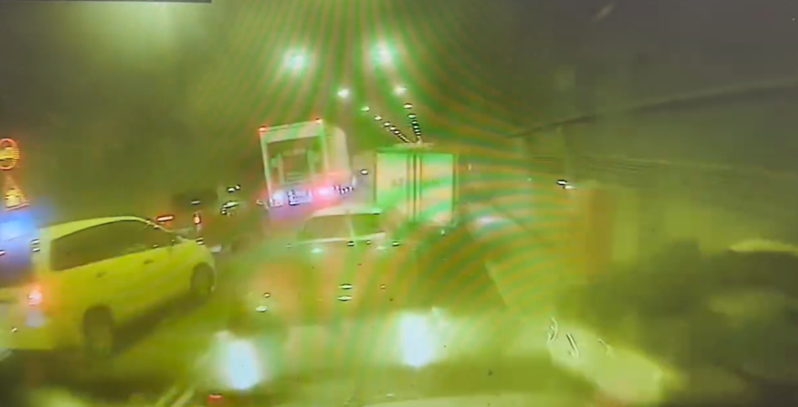 根據最新曝光畫面顯示,隧道內前方車流回堵,但肇事大車完全沒有減速,直直往前開,下秒撞上前方車輛,造成多部轎車變形、擋風離全碎,可見撞擊力道之大。