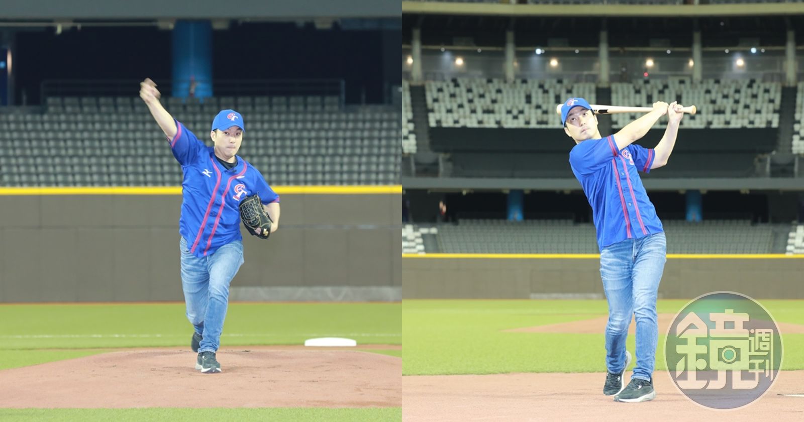 蔣萬安今日身穿藍色CT球衣開箱大巨蛋,除了坐在觀眾席上感受觀賽視野,也進入球場內摸摸紅土、踩踩草皮,還站上投手丘做出投球姿勢、站在打擊區揮棒,並「試撞」球場防撞軟墊、嘗試從休息區「跨欄」進場內。