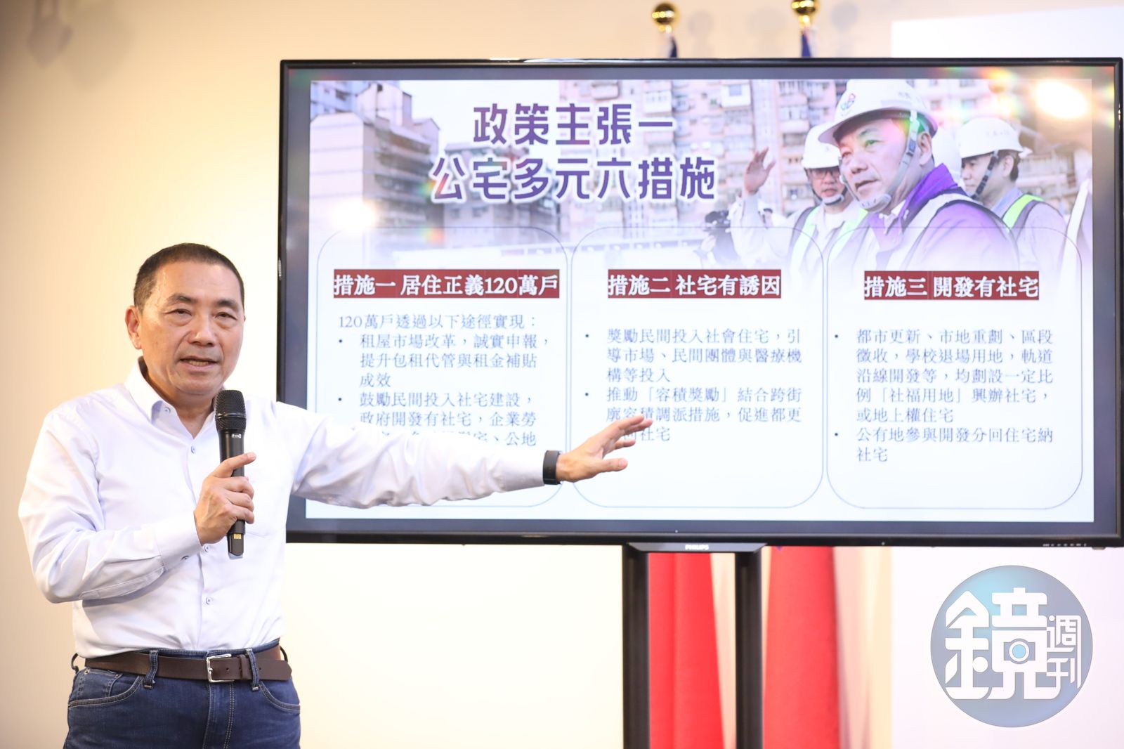 針對「公宅多元六措施」,侯友宜談及「居住正義120萬戶」,租屋市場改革及誠實申報措施,大幅提升包租代管與租金補貼,鼓勵民間投入社宅行列,政府開發社宅,企業勞工宅、多元銀髮宅、公共地上權住宅。「社宅有誘因」獎勵民間投入社會住宅,推動「容積獎勵」結合跨街廓容積調派措施,促進都更分回社宅。「開發有社宅」都市更新、市地重劃、區段徵收,學校退場用地,軌道沿線開發等,均劃設一定比例「社福用地」興辦社宅,或地上權住宅公有地參與開發分回住宅納社宅。