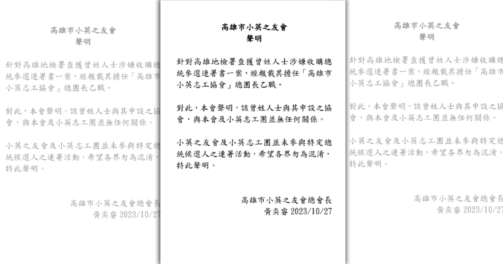 高雄市小英之友會總會長黃奕睿今(27)日澄清,曾睿涵與高雄市小英之友會及小英志工團並無任何關係。(高雄市小英之友會提供)發布時間:2023.10.27 16:48 臺北時間
