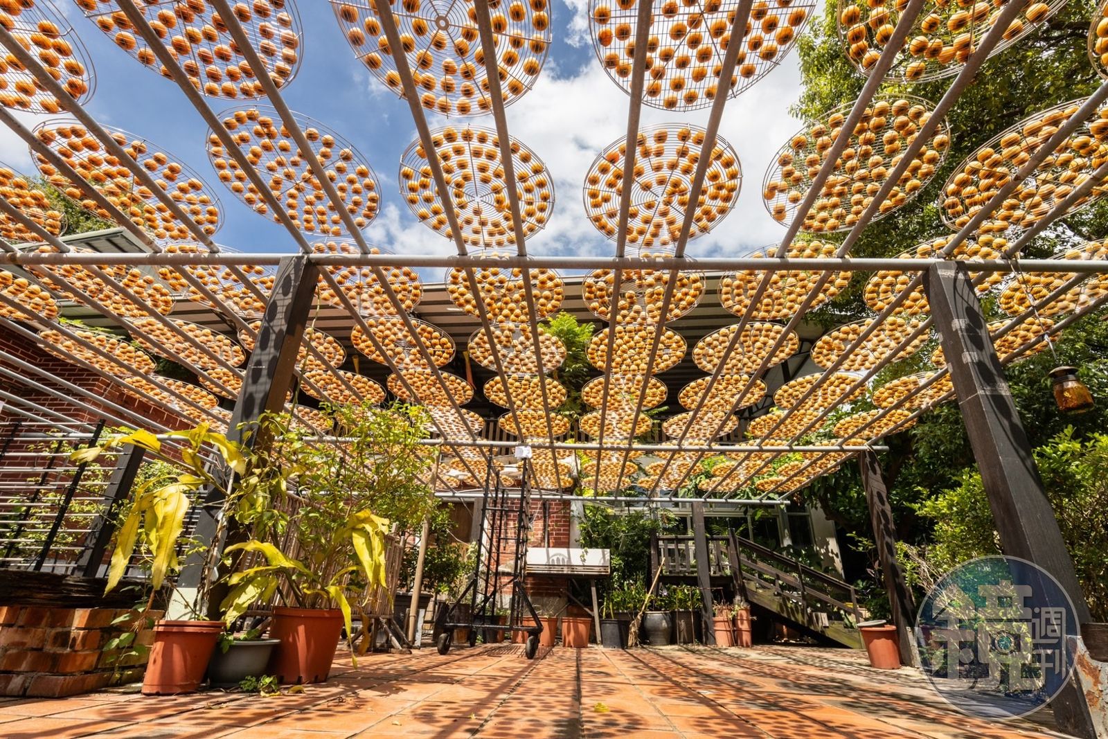 採訪當日還不確定能不能拍到滿滿、壯觀的曬柿畫面,抵達「金漢柿餅教育農園」驚喜看見近乎完美的晴空,正對著紅磚三合院的曬柿場,大片黃澄亮眼柿子就這樣鋪開;陽光更打造出一片「普普風」的柿影,令人移不開視線,也讓許多入園遊客把握機會多拍幾張網美照。