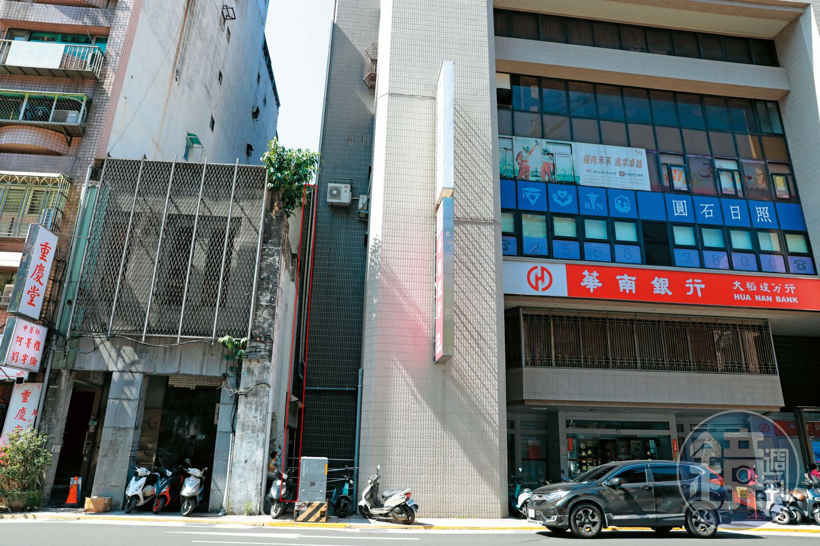 謝松善接獲通報到場採證,現場留有電鑽、電鋸、鐵剪等犯案工具,他從歹徒鑿出的孔洞往外看,是一條寬度約僅30公分的防火巷。謝走到外面查看,發現銀行所在位置是一棟10層樓建築物,與一旁3層樓的民宅緊連,民宅正在施工,兩者之間只有防火巷。