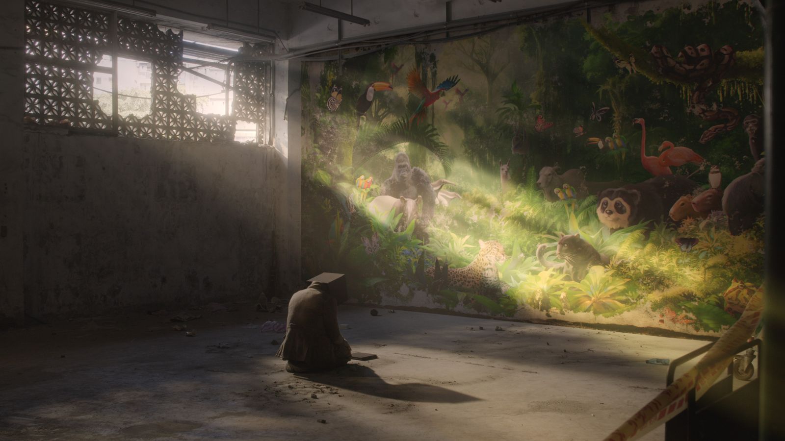 導演:《黑盒子》本身是相對比較實的故事,那我一直在思考,如何給觀眾一個視覺上比較有衝擊感的內容,所以設計了這一段,也是要表現他與過去生活的一個連結。壁畫是南美洲的叢林,那其實是江啟漢對於原本生活的一個執念;但他已經換了一個身分(流浪漢)、換了一個生活,那是他沒有辦法完成的一個夢想。