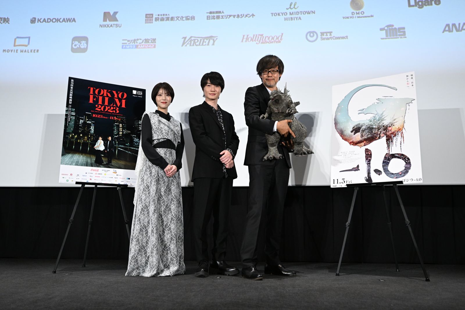 《哥吉拉-1.0》是哥吉拉70週年的紀念作品,過去哥吉拉系列只要推出新作,都會在東京影展放映,今年公布閉幕片消息後,引發哥吉拉鐵粉搶票大戰,購票得靠抽籤,濱邊說:「聽說這一場超級難抽中,各位也是在正式上映(11月3日)前最先看到作品的觀眾,今天我不能爆太多雷,希望大家會喜歡。」