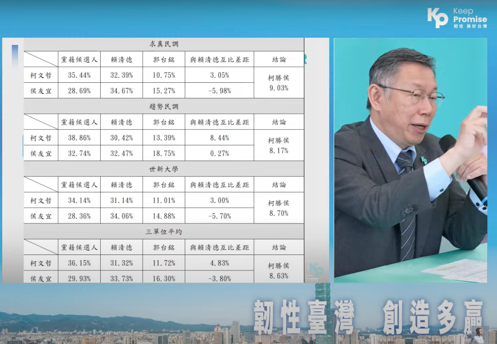 民眾黨委託的3家民調公司包括求真、趨勢及世新大學,在11月3至7日,各自進行有效樣本約3000人的民調。求真的部分,有效樣本共3021人(市話2109份、手機912份),若柯對上賴、郭,柯35. 44%、賴32. 39%、郭10.75%,柯贏賴3. 05%,若侯對上賴、郭,侯28.69%、賴34. 67%、郭15.27%,侯輸賴5. 98%;比較柯、侯對上賴的差距,柯勝侯9.03%。