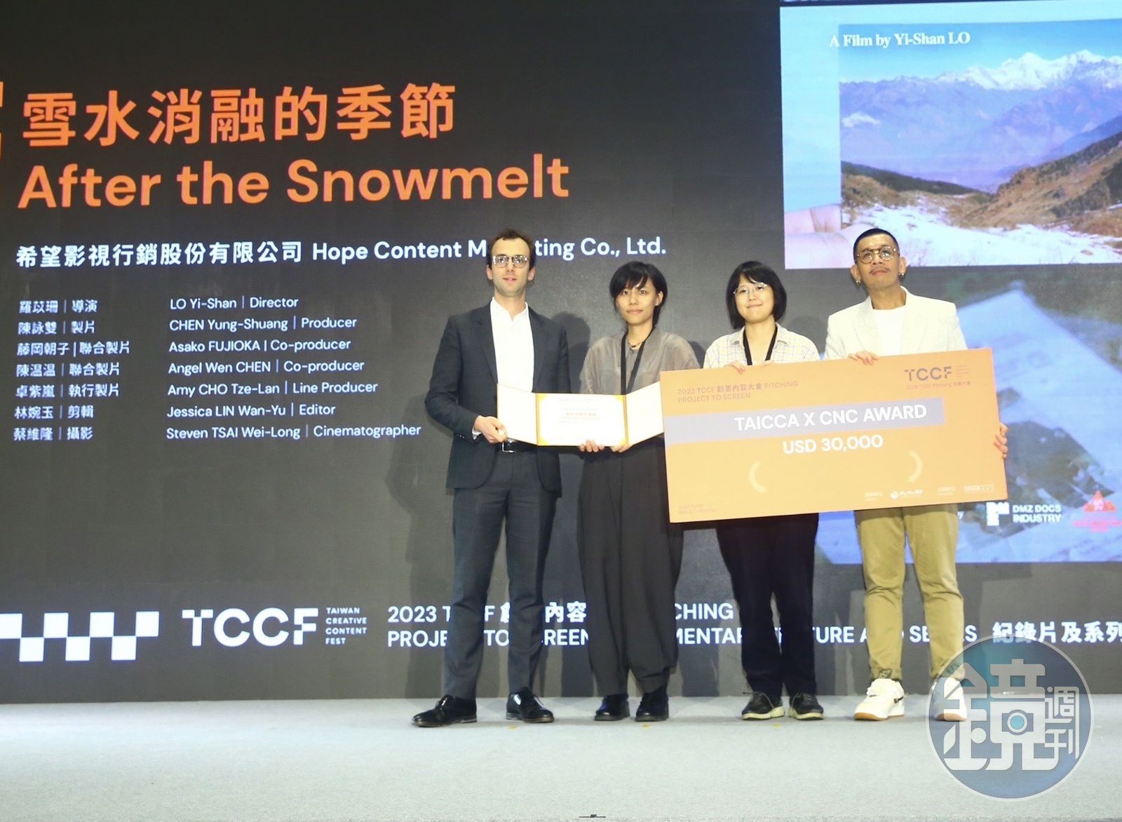 《雪水消融的季節》是台灣導演羅苡珊首部紀錄長片,描述她的摯友前往尼泊爾登山卻不幸罹難,多年後她重回摯友走過的山路,過程中也得到自我療癒。羅苡珊表示,此次獲獎完全出乎預期,這是第一次文策院有紀錄片專場提案,入選已經很開心,「台灣紀錄片沒有很多國際提案機會,TCCF 不只提供其他類型提案,也提供紀錄片類別,這對紀錄片向世界發聲是很大的鼓勵。」