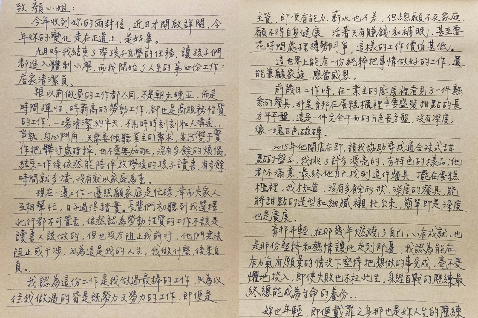 陳昱芳同時公開今年寄出給顏女的親筆信,提及近期她找了份居家清潔員工作,某日在業主的廚房看見一件甜點盤,讓她想起2015年開店在即、燃燒了自己的弟弟,「身經百戰的歷練最終總能成為生命的養分」。她認為顏女還年輕,「即便戴罪之身那也是妳人生的歷練之一,轉念往正道也是磨練」「妳積極參加任何事物,都代表著妳有活下去的決心,準備重返這人情冷暖的社會活著贖罪,是好事。」