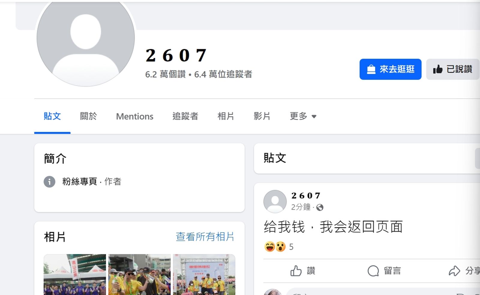 擁有6.4萬個追蹤者的泰山企業臉書粉專今(16日)下午遭駭客入侵,大頭貼變成空白,也改名為「2607」,16時許以簡體字發文:「給我錢,我會返回頁面」,並在留言區留下「chicken」,囂張行徑引發網友關注。 目前查看該粉專已顯示「目前無法查看此內容」。據《風傳媒》報導,面對網友詢問「這發生什麼事?頭貼呢?」駭客還用泰山的粉專回應「hack hack。」據《自由時報》報導,泰山表示,公司內部正在處理中。