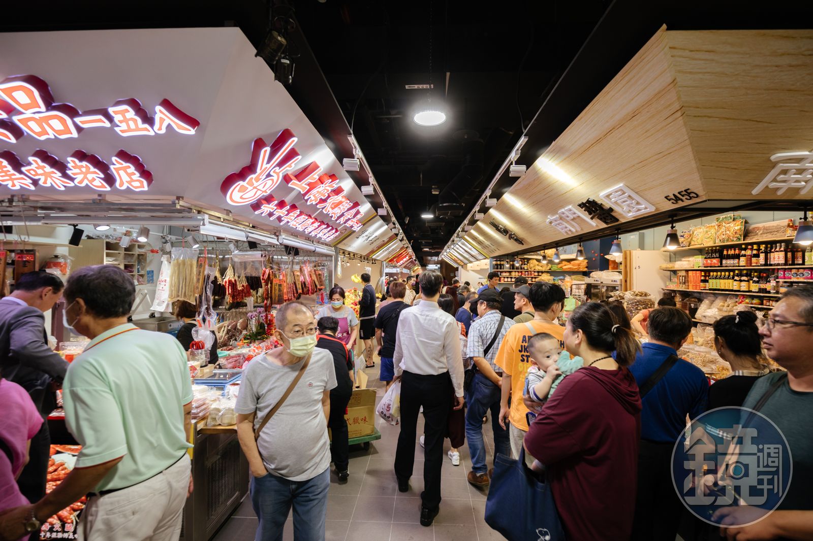人潮中目光掃到熟悉身影,「金龍肉乾創始店」老闆娘白玉嬌,一邊忙著將烤爐上的肉片翻面、一邊不時回頭和熟客寒暄,她喜上眉梢說著:「搬家當然開心啊!我們現在改住高級大樓餒,之前嫌中繼市場太遠的老客人,又都回來了。」