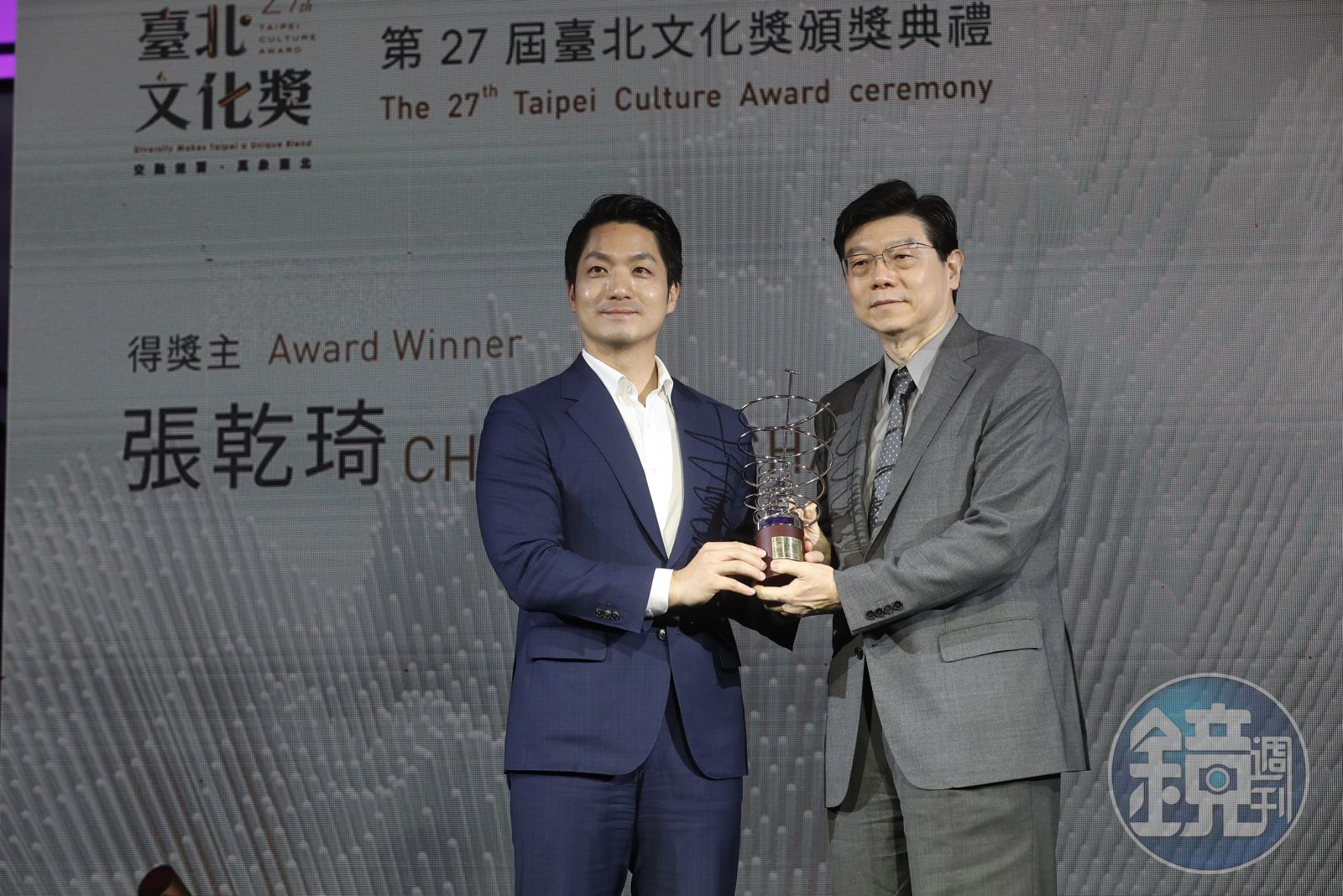 過去1年,《鏡週刊》特約攝影家張乾琦,先後4次進入戰火交熾的烏克蘭拍攝,在鏡週刊出版了〈逆襲 張乾琦烏東戰地攝影紀實〉、〈【鏡相人間】凝視頓巴斯 張乾琦的戰地攝影紀實〉、〈【獨家授權】前線的前線 攝影師張乾琦烏克蘭直擊〉及〈【張乾琦烏克蘭紀實】病後再次踏上戰火不休之地〉4篇報導。張乾琦本人不克出席,由《鏡週刊》社長裴偉代為領獎,並發表感言:「影像紀錄不止是生活的一部分,也是一種生活方式。能夠獲得台北文化獎的肯定,倍感榮幸。攝影一直是很個人的語言,經常在朝著他人離開的方向,逆行前進,在一團混亂中,看到一種視覺秩序。在記錄中創作,在創作中紀錄。每一個鏡頭的選擇,每一次光圈和快門的組成,都是腦、眼、心在同一軸線上的決定。每一個深度紀錄影像專題,其實都有自傳的一部分,將來放在一個更大的圖像裡,這些作品,是一環扣一環的。我很幸運能夠去危就安,持續做自己應該做的事。我要特別感謝父母的養育之恩。謝謝我的兩個孩子,他們讓我明白什麼是無條件的愛。我和我的父母以及我的孩子分享臺北文化獎這份殊榮。與此同時,我也謝謝馬格蘭攝影同業彼此的敦促,特別感謝鏡週刊裴社長和典藏雜誌簡社長,謝謝你們,謝謝大家。」