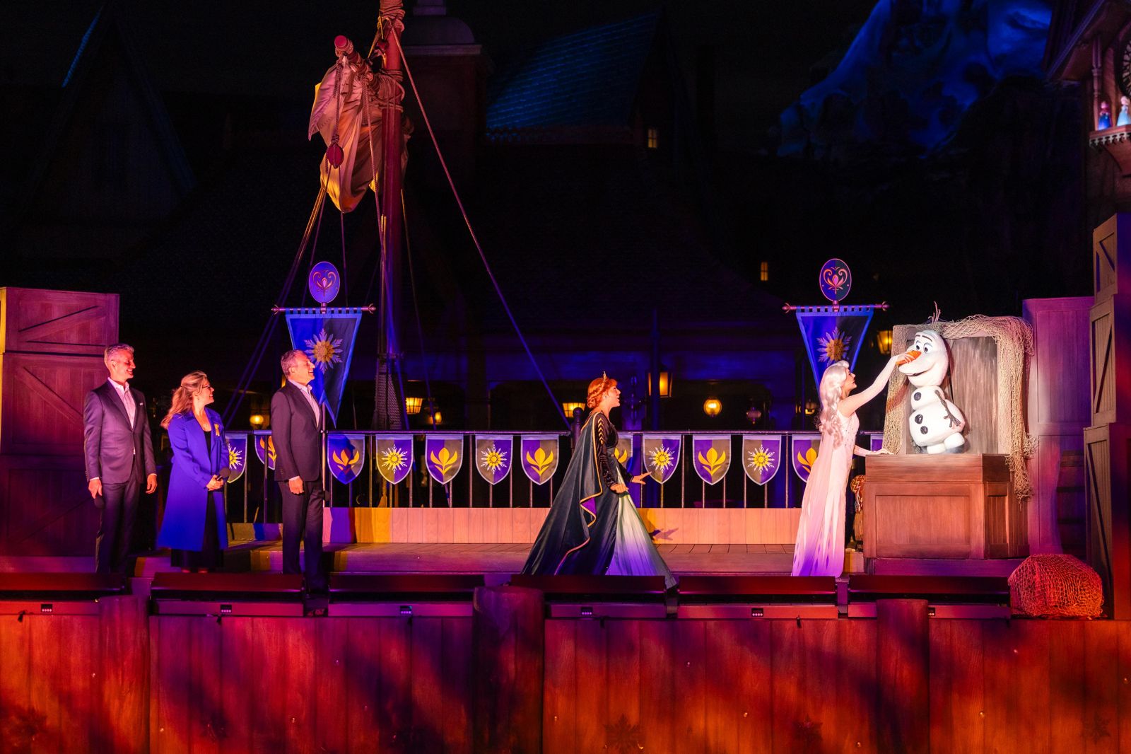 在晚間,盛大的揭幕儀式於園區的艾倫戴爾港口登場,由艾倫戴爾皇家詠唱隊現場演出《冰雪奇緣》主題歌曲組曲,歡迎大家的到來。隨後由艾沙施展魔法,召喚雪寶現身,安娜隨即宣佈打開艾倫戴爾大門,在星空下展開夜間派對。最後以無人機表演,象徵艾沙魔法點亮的夜空,把氣氛帶到最高點。