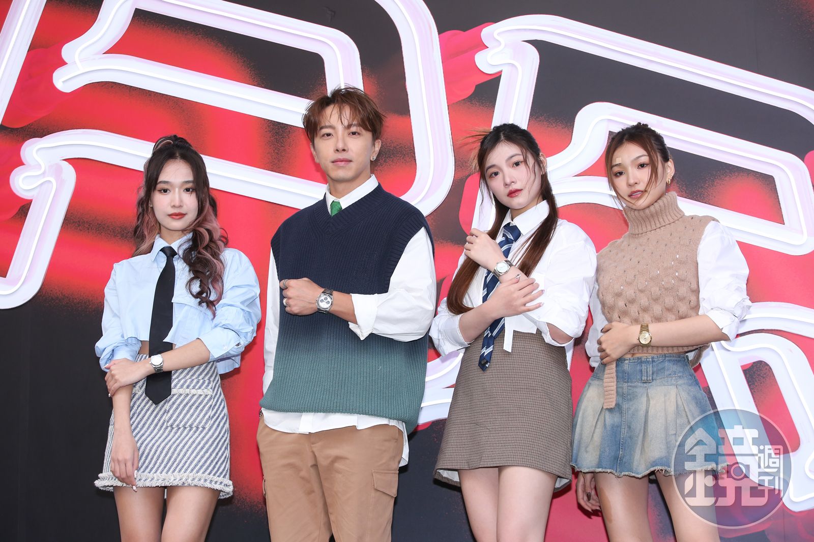 坤達今天偕同「未來少女」黑曜精靈成員力安、紫嫣、郭郭出席瑞士鐘錶品牌天梭(TISSOT)快閃派對,坤達笑說原本不在意自己的年齡,但一看到三位少女,立刻有了「長輩感」!