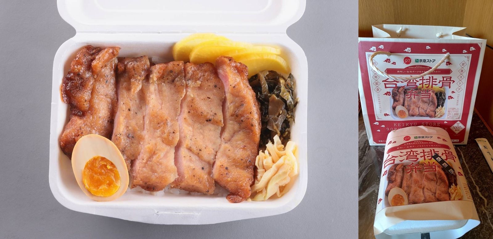 這款台灣排骨便當選用經典熟成里肌肉排,搭配3樣漬物配菜及半顆溏心蛋,每個售價500日圓,以今日的匯率換算,只要新台幣約106元。