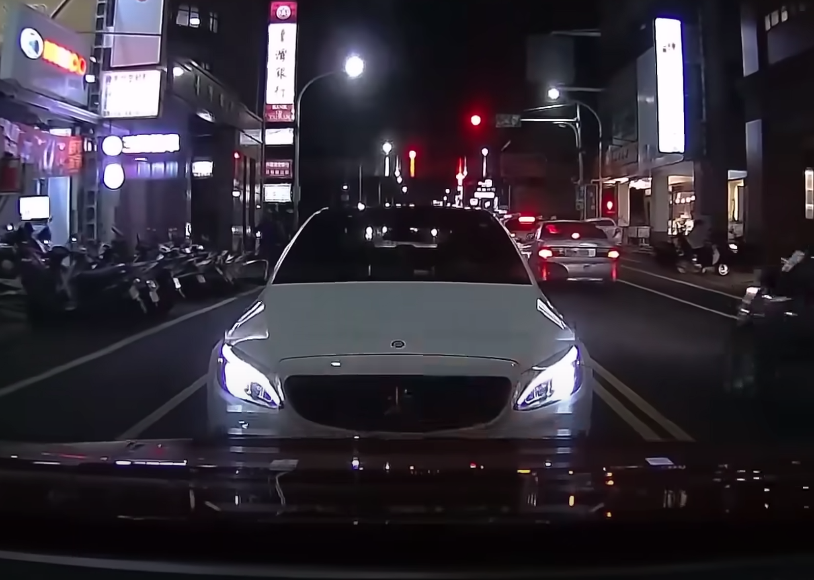 男子為求安全,先鳴按喇叭提醒白賓士駕駛便前行,未料白賓士車主遭激怒,氣得衝回駕駛座發動轎車一路鳴按喇叭,逼車加上連連叫囂「叭X小」,男駕駛則一路冷靜前行,並朝警察局方向行駛,白賓士尾隨一段落後才悻悻然離去。