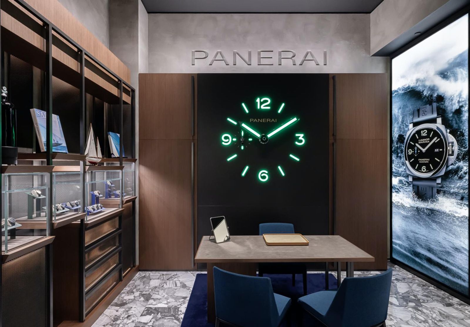 店內的許多裝潢都取材自沛納海錶款的外型元素。例如大門門把是品牌最著名的「錶冠護橋」設計;牆上有沛納海經典夜光錶盤的壁鐘,另一側靈感來自於世界最著名的歌劇院之一,米蘭「史卡拉歌劇院」的深紅色布幕,而混凝土壁面、大理石紋地板、木質飾面和金屬網格的裝潢,也都充滿義大利元素。