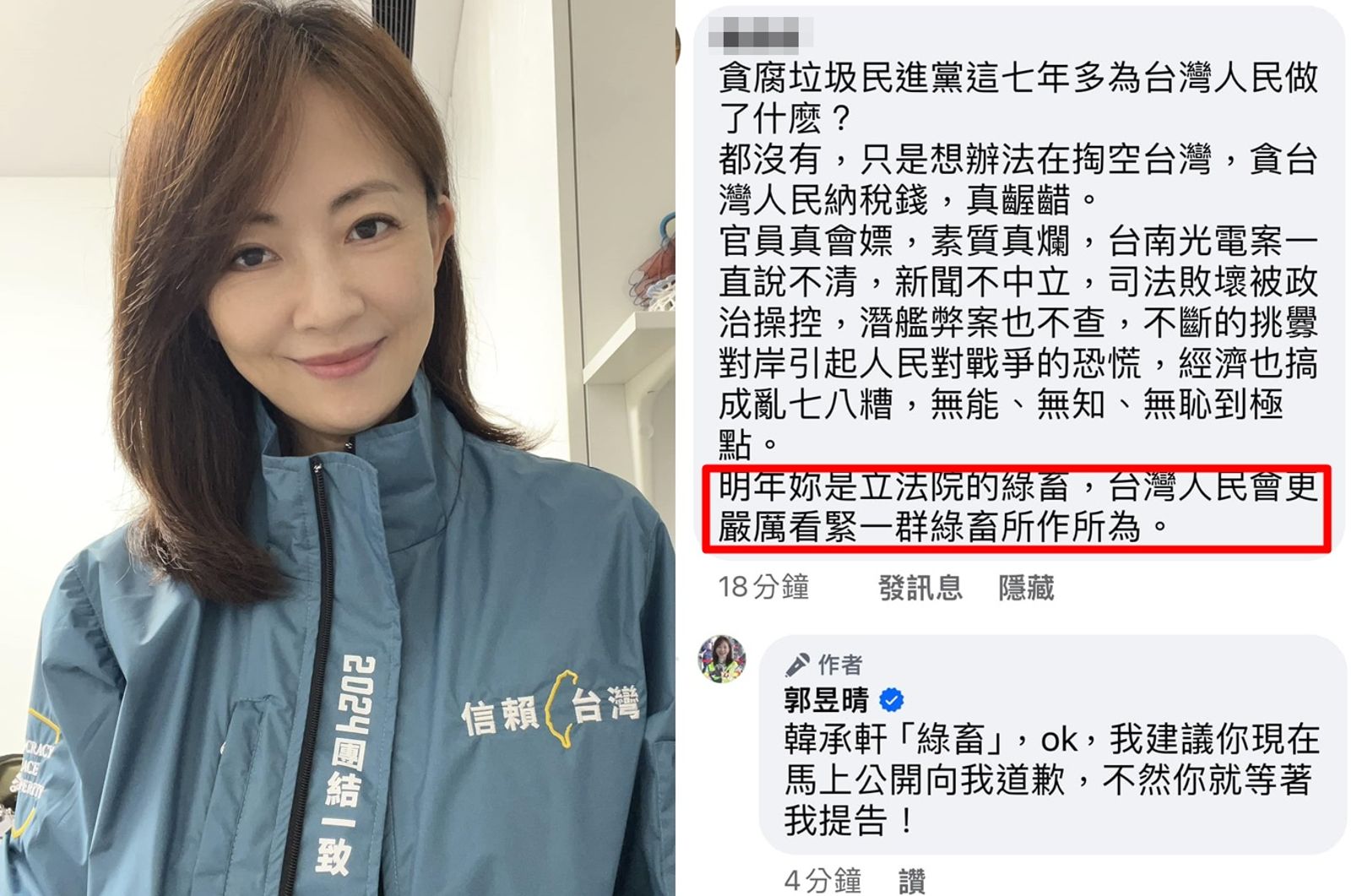 豈料消息公布後,有網友29日跑至郭昱晴臉書開酸,抨擊民進黨過去執政7年無作為,稱在文末寫下「明年妳是立法院的綠畜,台灣人民會更嚴厲看緊一群綠畜的所作所為」。