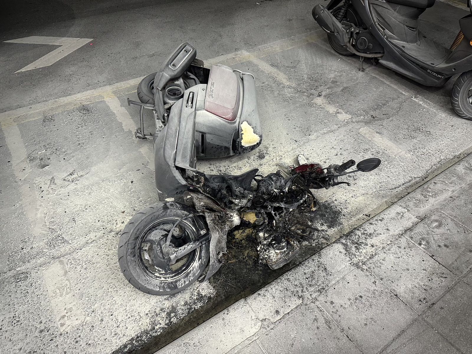 遭縱火的機車被燒得面目全非,僅剩骨架。(翻攝畫面)發布時間:2023.11.30 17:03 臺北時間