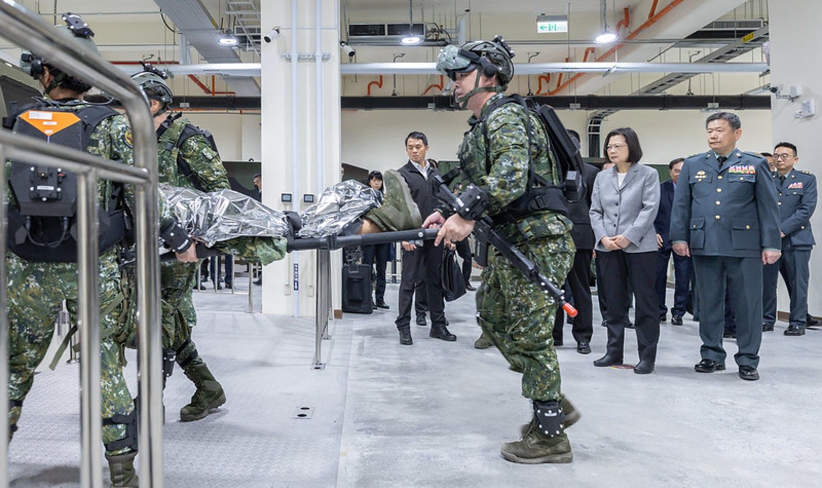 蔡英文致詞後,也與現場貴賓一同進行啟用儀式,並在衛訓中心主任蔡忠勤導覽下,視導重大災情情境教室、戰術戰傷情境教室及載具救護訓練教室,聽取各項模擬訓練系統功能介紹,並觀看現場演練。