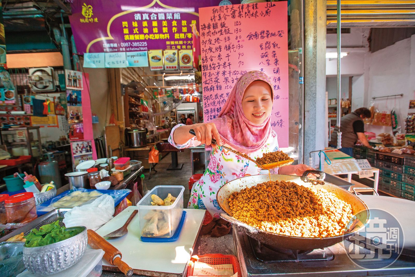今年6月,閃妹小廚從開了5年的舊址,搬進中壢龍岡忠貞市場,這裡是全台最大滇、緬、泰美食集散地,附近有清真寺,因此聚集許多不同樣態的伊斯蘭教食材與美食。「店裡賣的東西很多,都是自己想吃,看電視、食譜試著做,有調整配方、放我自己做的醬。外面的東西吃不放心,不知道加了什麼。你們怕防腐劑,我們怕的是有豬油之類的。」不能吃豬肉、不可飲酒,肉品宰殺前先念「奉真主之名」、還必須將血放乾,確保食品乾淨,清真飲食規定嚴格,而閃妹小廚就是經過認證的店家,「申請的時候要提交供應商資訊,連奶茶用什麼牌子的奶精都檢查,確定沒用到從豬提煉出來的成分。」