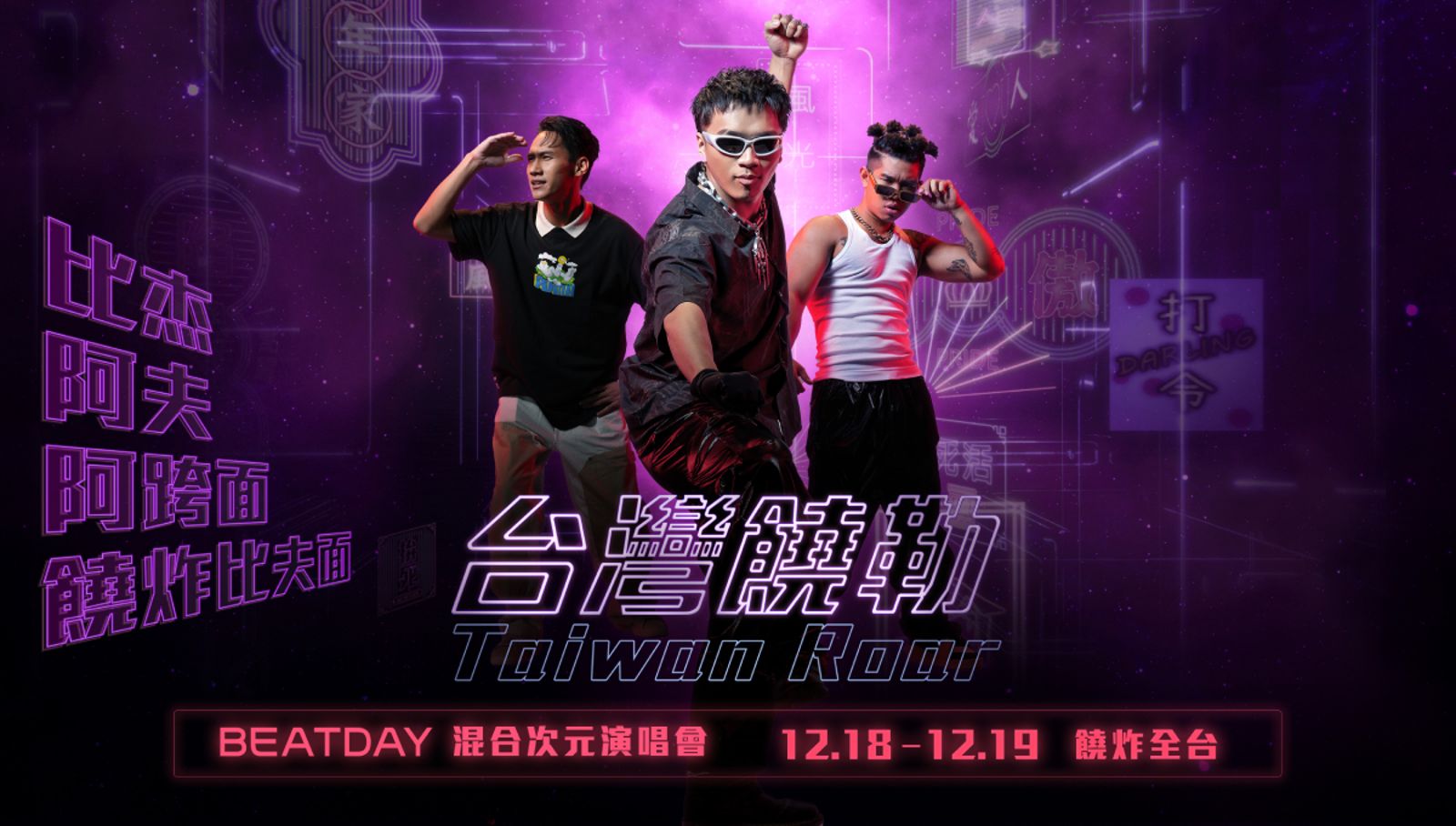 BEATDAY《台灣饒勒-饒炸比夫面》混合次元演唱會特別為3位嘻哈歌手的演出內容打造專屬的主題風格與視覺特效,阿跨面的舞台運用時光迴廊概念,在街景中將他一路打拚想要感謝的兄弟名單設計進旗子裡;阿夫的舞台設計則以辣妹做主題,讓觀眾大飽眼福;比杰則以最能象徵他的「肌肉拳擊擂台」詮釋。演唱會過程中,觀眾還可以和歌手大玩互動,例如大家可以集合一起到比杰腋下「聞腋」、丟特殊道具給阿夫滿足他的心願等,提供粉絲獨一無二的超現實體驗。比杰笑稱互動:「絕對香!歡迎大家一起來聞!」