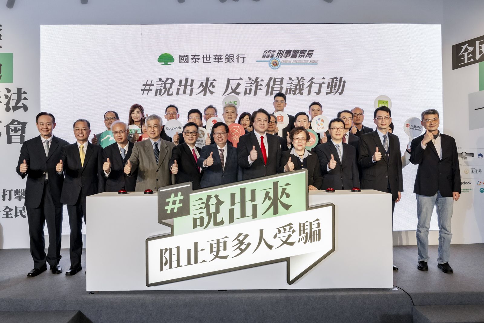 國泰世華銀行攜手行政院、金管會、高檢署、國家通訊傳播委員會、數位產業署、內政部警政署刑事局,以及兆豐、中國信託、台北富邦、台新、玉山、永豐等銀行業者,以及趨勢科技、Gogolook、LINE、Klook、蝦皮購物、博客來等企業,一同分享詐騙案例,希望讓民眾提升詐騙意識。