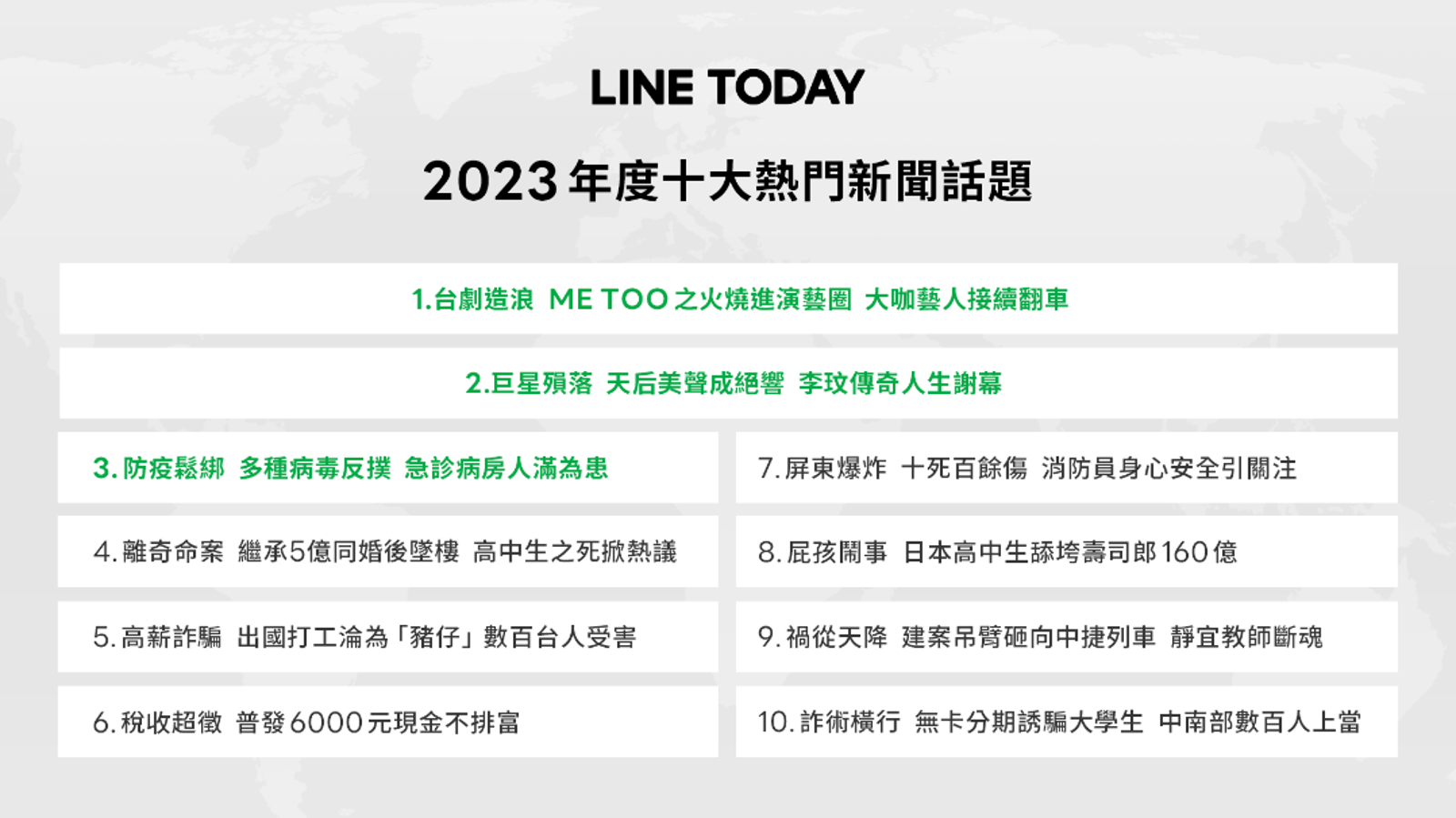 LINE TODAY公布「2023年度十大熱門新聞話題」,又以娛樂新聞最受矚目,其中「Me Too事件」讓大咖藝人接續翻車、「天后李玟逝世」傳奇歌后的殞落,分別為年度新聞第一、二名;「防疫政策鬆綁,多種病毒反撲」登上第三名,反應出大眾在疫情後對傳染病的敏感。隨著俄烏戰爭常態化,國際戰爭話題關注下降,民眾轉向關注與生活密切相關的「國內民生社會議題」,尤其以「繼承5億高中生墜樓」社會案件、「普發6000」福利政策、「屏東爆炸」與「建案吊臂砸中中捷列車」等消防公共安全最受矚目。