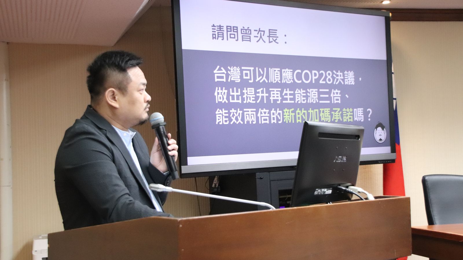曾文生回應,以2022年為基礎年,2030年光電、風電裝置容量達三倍,與目前政府規劃的政策方向相符,承諾會達成目標。關於能源效率,去年在GDP成長之下,初級能源供給密集度年平均改善4.2%,超過國際上要求從2%提升到4%的目標,且今年有機會可以超過6%。立委洪申翰要求,台灣政策應該順應COP28決議當中最重要的「綠能三倍、能效翻倍」共識,曾文生正面回應,經濟部在這個方向上會接軌國際共識。