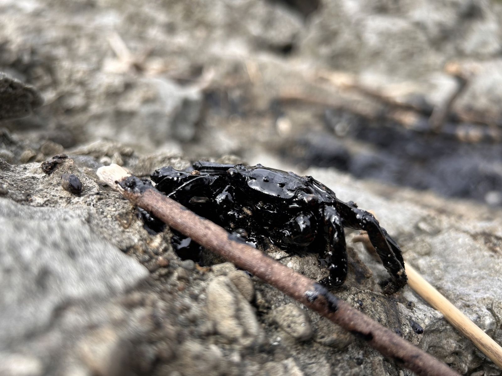 洪申翰在臉書上PO出呈現黑色的螃蟹、黑色海岸線等照片,他說,這隻綠島螃蟹身上不是海藻,是濃厚的重油汙染,也是最近發生在宜蘭大里的畫面,濃厚的重油汙覆蓋在礁岩上,不只影響海面更侵害到礁岩周邊的生態環境。更麻煩的是,不只發生在 綠島、宜蘭,也出現在台灣整個東海岸,包含屏東、台東;甚至在宜蘭大里,重油汙染在海蝕平台周邊綿延了3、4公里,令人怵目驚心。
