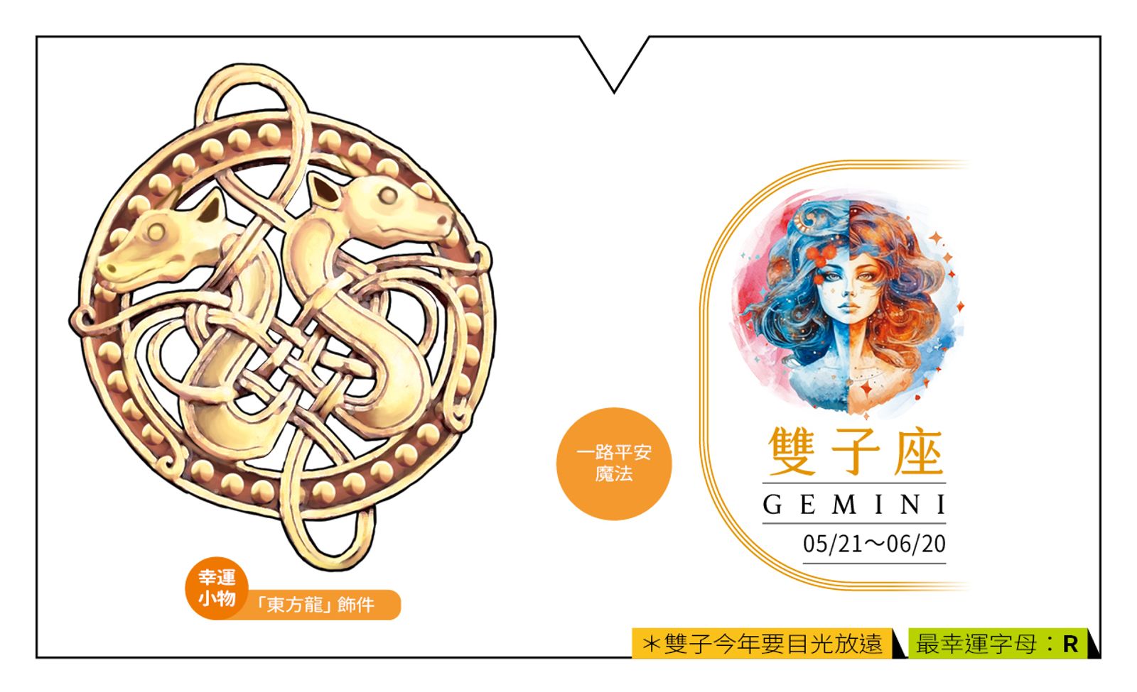 今年健康開弱走強。上半年歲星在療癒宮,健康相對弱勢,小心呼吸道疾病。下半年當運,頗有邪魔不近、災病難侵的氣勢。聆聽身體訊號、採行相應的合理節奏,維持高效且寬緊適中的健康管理才是王道。宜少量多餐、提高代謝率。 幸運小物 「東方龍」飾件 東方龍是象徵力量、權勢、富貴、無畏、長壽與智慧的至尊神獸。作為強大護身符,有擋煞、發達、成功、聚財和贏得良緣等幸運作用。