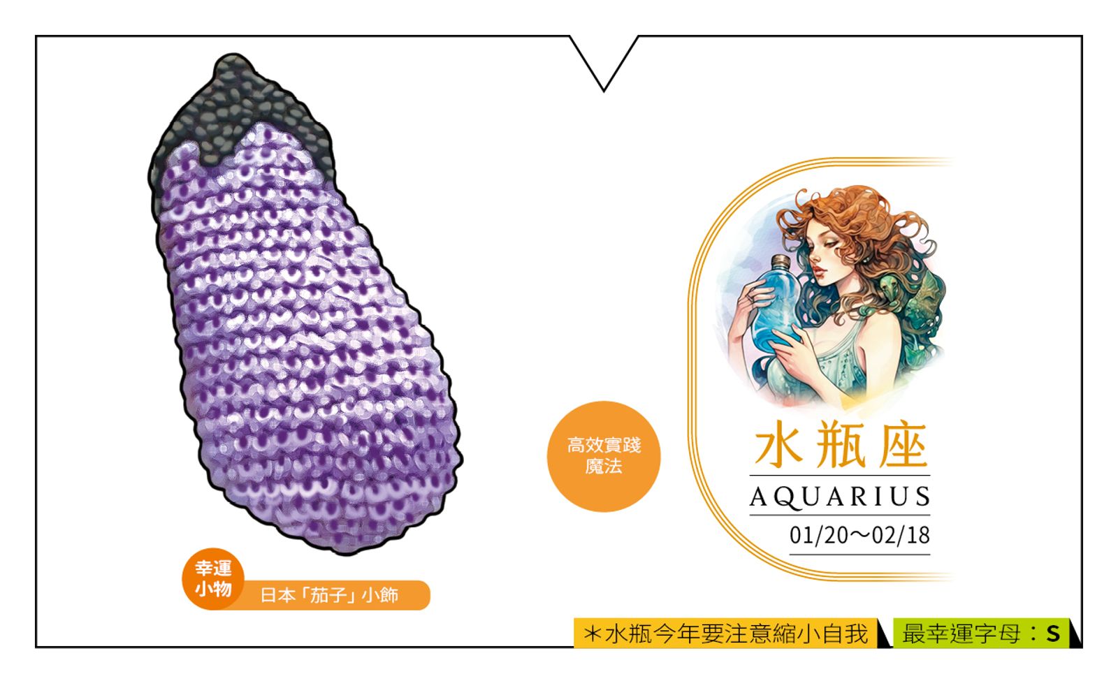 健康雖小有隱憂,但比去年好很多。要注意今年冥王星進駐命宮伴隨的潛在慢性病訊號。宜提高健康意識,愛惜身體、定期健檢,以利早期發現、及時治療。喉嚨、腸胃與肩頸是今年較脆弱的部位。節制美食誘惑,並注意壓力管理。 幸運小物 日本「茄子」小飾 日本三大招福「緣起物」之一的「茄子」,發音(Nasu)的諧音有「事成」的意思。出現在新年第1個夢裡,是全年家庭和睦、豐收幸福的好兆頭。