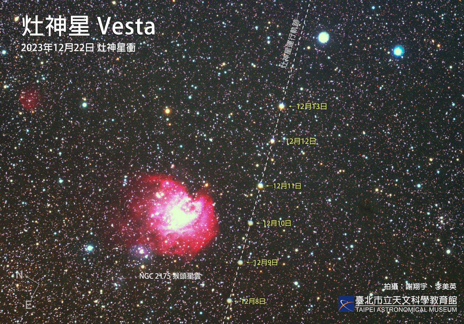 天文館表示,漫長的夜晚也讓觀賞星象有了更充足的時間,冬至同日的2時56分,太陽系最亮的小行星灶神星(Vesta)將運行到「衝」的位置。此時灶神星位於獵戶座內,整夜可見,亮度6.4等,用雙筒望遠鏡便可找到它的蹤跡。