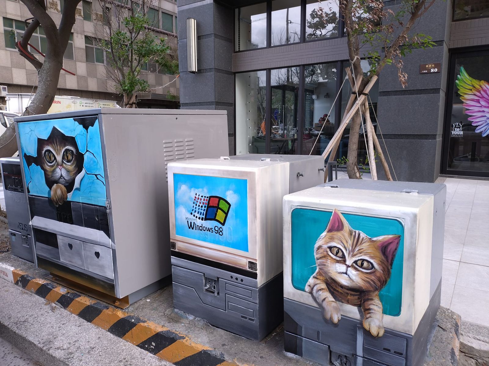 台灣路上隨處可見綠色的變電箱,外觀時常有山水畫、或是被人違規張貼廣告的情形,台中有一條路上卻出現超可愛的變電箱,外觀彩繪偽裝成電腦、咖啡機、烘碗機等,還有貓咪出沒,讓網友看了都大讚美化市容,希望所有變電箱都該效法。