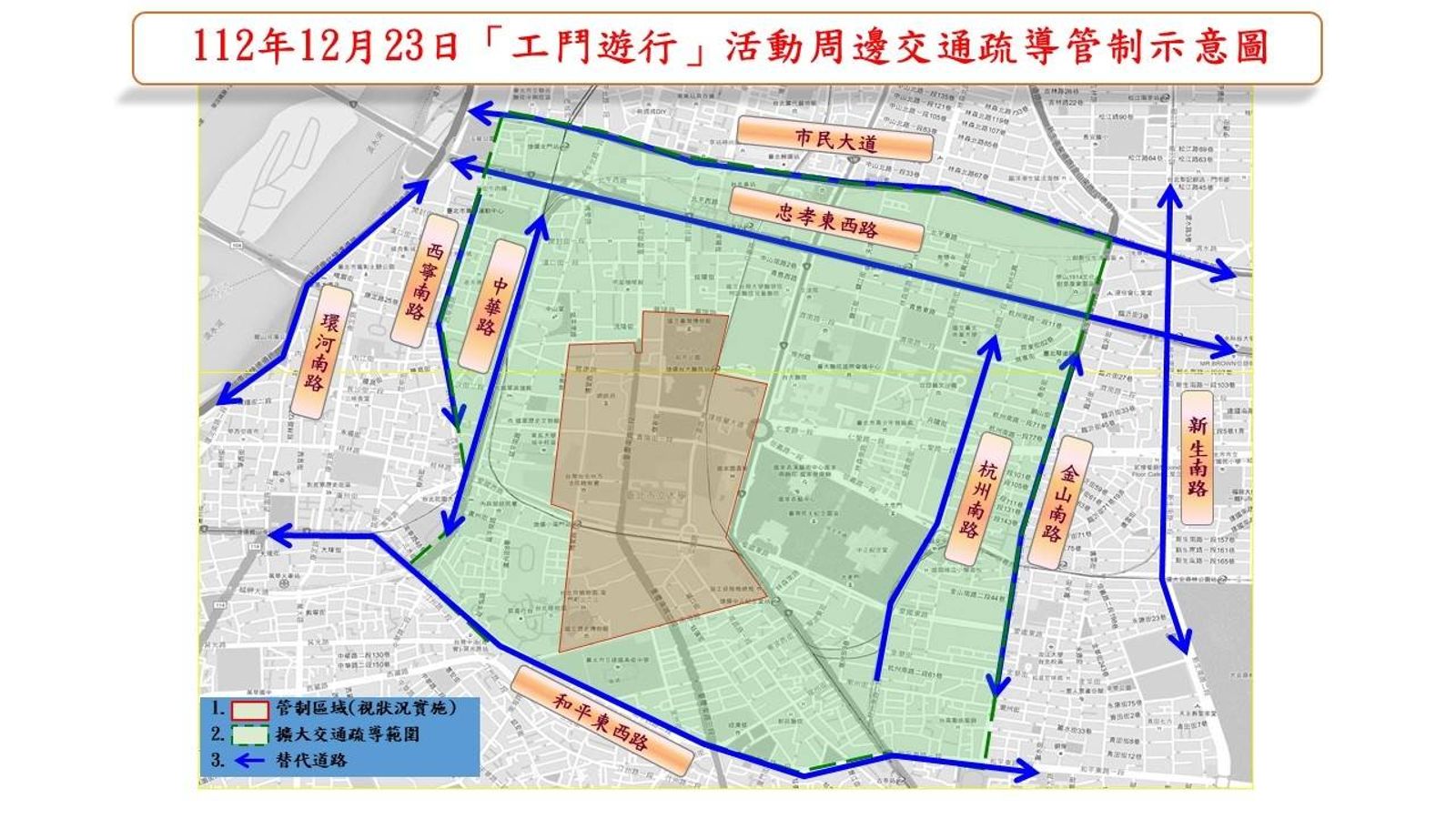 管制區域包括:桃源街(不含)、博愛路(含)以東;衡陽路、襄陽路、常德街(均不含)以南;公園路、中山南路、羅斯福路(均不含)以西;和平西路、南海路(均不含)以北等,所圍區域。
