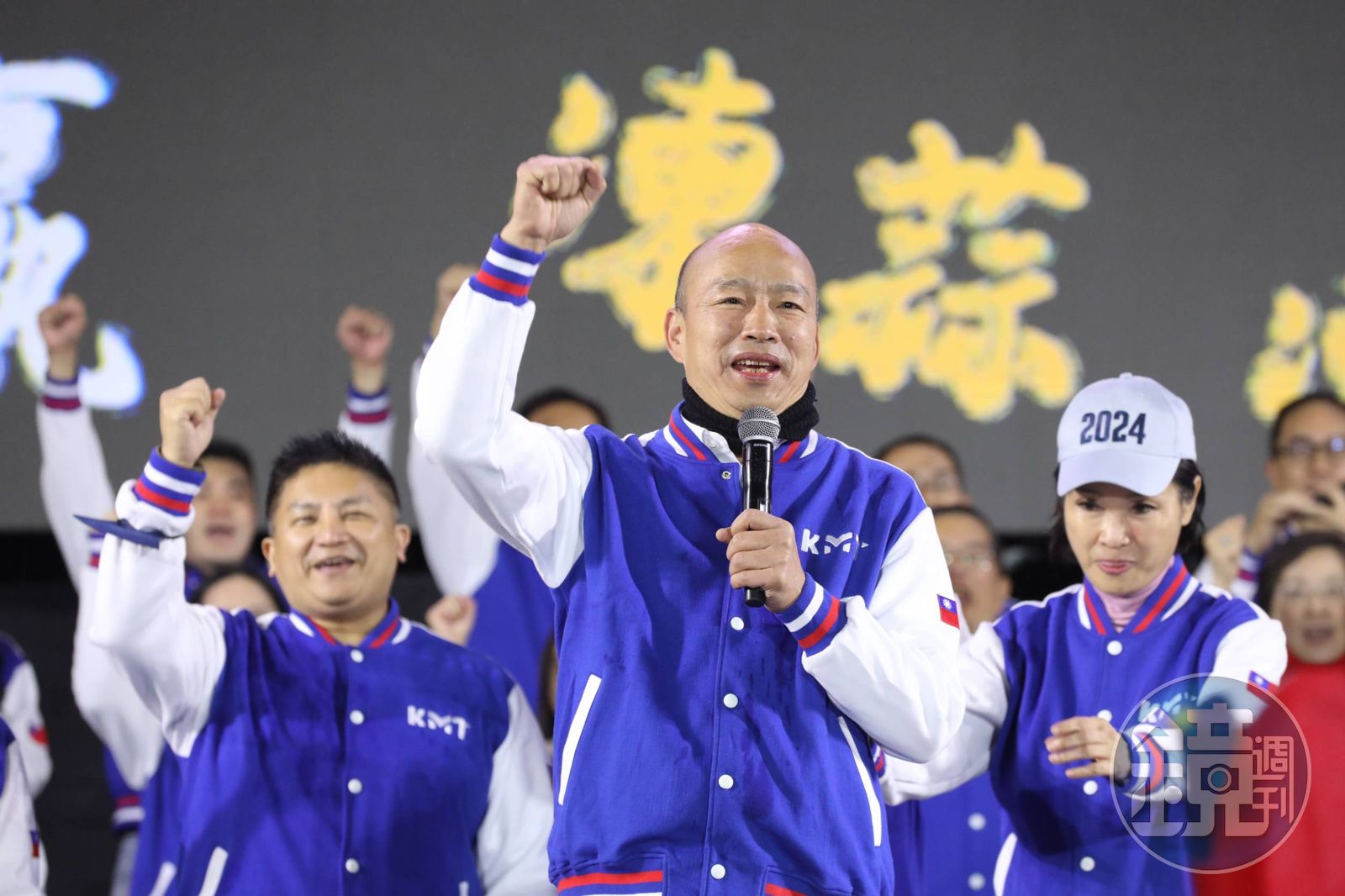 藍營最高人氣的「辣個男人」韓國瑜,在8點左右帶領所有國民黨不分區立委登場,並替侯康出場暖身。沒想到韓一上台,現場所有群眾立刻全數起立,大喊「韓國瑜凍蒜!」尖叫聲更是不斷,氣氛頓時嗨到最高潮。